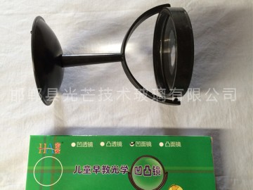 带底座凹透镜 直径:10厘米 焦距:负300mm 幼儿园小朋友 或者中小学生认识凹透镜的特点 学习凹透镜光学原理的的器材 尺寸大也时候教师教学演示用教具 知识拓展阅读: 凸透镜与凹透镜可以从以下几个方面加以区别:外形特征、对光线的作用、成像特点及用途等。具体方法如下:   方法一:用手摸,镜子的中央部分比边缘厚的是凸透镜,镜子的中央部分比边缘薄的是凹透镜。   方法二:隔着镜子观察距镜子较近的书上的字,有放大作用的是凸透镜;字变小的是凹透镜。   方法三:隔着镜子观察距镜子较近的书上的字,移动镜子,若发现像的移动方向总是与镜子的移动方向相同,则该镜子是凹透镜;若发现像的移动方向总是与镜子的移动方向相反,则该镜子是凸透镜。   方法四:隔着镜子观察窗外的物体,若能看到上下左右都颠倒的像,这种镜子是凸透镜;若看到像是正立的,这种镜子是凹透镜。   方法五:将点燃的蜡烛放在离透镜适当距离处,在另一侧光屏上能得到倒立实像的是凸透镜;无论怎样调节,在另一侧光屏上不能得到像的是凹透镜。   方法六:让镜子正对太阳光照射,在镜子的另一侧放一张与透镜平行的白色卡片纸,耐心调节镜子与纸之间的距离,能得到一个小亮点的是凸透镜;始终不能获得小亮点的是凹透镜。   方法七:观察阳光通过了两副眼镜在地面上形成的光斑,若形成光斑的中间比四周明亮,则镜子是凸透镜;若形成光斑的中间比四周暗,则镜子是凹透镜。   方法八:近视眼镜,是用凹透镜做成的。老花镜,是用凸透镜做成的。   说明:辨别凸透镜与凹透镜有好多方法,哪种方法好,要视具体情况而定。例如,如果待辨别透镜的中央与边缘的厚薄差异不明显,就不能用“摸”的方法(况且精密光学仪器是不允许直接用手去摸的);在有太阳光与没有太阳光的场合,所选的方法也不同。总之,一种好方法,应该简便、易行、有效。它是随场合变化而变化的,不宜一概而论。   技巧:当你想要判别两件事物的相同和不同之处时,就需要用比较与对比的方法。比较就是找出事物的相似性,即共同特征。对比是找出事物的不同点。用这种方法来分析事物,能帮助你发现一些平时容易忽略的细节。